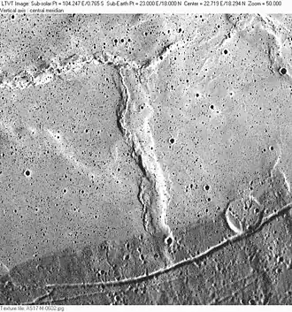 ![]() Vista desde el Apolo 17, con la Rimae Plinio tangente al borde inferior del cráter | ||