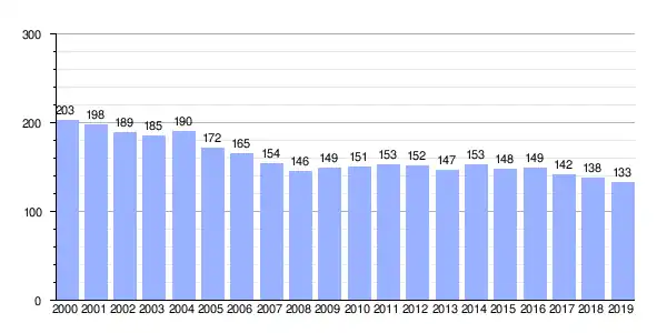 | Gráfica de evolución demográfica de Brantuas entre 2000 y 2019 |