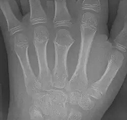 | Síntomas | Un metacarpiano más cortó de lo normal, resultando en un dedo que es aparentemente más cortó de lo normal. | |