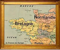 Bretaña (en francés: ⓘ; en bretón: Breizh, [bʁɛjs], [bʁɛx];[1] en galó: Bertaèyn [bəʁtaɛɲ]) es una península, un país histórico y una región cultural en el noroeste de la Francia moderna. Esta región comprende la parte occidental de lo que se conocía como Armórica durante el periodo de ocupación romana. Con el tiempo, evolucionó para convertirse en un reino independiente y posteriormente en un ducado antes de unirse al Reino de Francia en 1532. Desde entonces, ha sido gobernada como una provincia autónoma bajo la Corona francesa.
