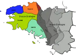 Bretaña como entidad política desapareció en 1790, cuando se dividió en cinco departamentos. Los départements bretones corresponden más o menos a las nueve diócesis católicas que aparecieron a principios de la Edad Media. A menudo se llamaban "pays" o "bro" ("país" en francés y en bretón) y también servían como distritos fiscales y militares.[36] Bretaña también se divide en Baja Bretaña ("Basse Bretagne" y "Breizh Izel"), que corresponde a la mitad occidental, donde se habla tradicionalmente el bretón y Alta Bretaña ("Haute Bretagne" y "Breizh Uhel"), que corresponde a la mitad oriental, donde se habla tradicionalmente el galó. Las diócesis históricas bretonas eran: