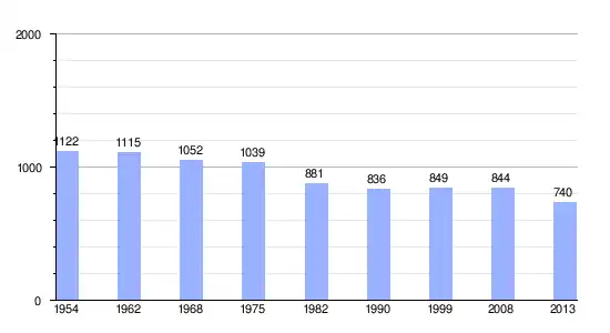 Los datos demográficos contemplados en este gráfico de la comuna de Brignogan-Plages[4] se han cogido de 1954 a 1999 de la página francesa EHESS/Cassini, y los demás datos de la página del INSEE.[5]