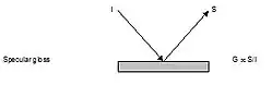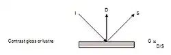 En 1937, Hunter,[3] [4]como parte de su artículo de investigación sobre el brillo, describió seis criterios visuales diferentes atribuidos al brillo aparente. Los siguientes diagramas muestran las relaciones entre un haz de luz incidente, I, un haz reflejado especularmente, S, un haz reflejado difusamente, D y un haz reflejado casi especularmente, B.