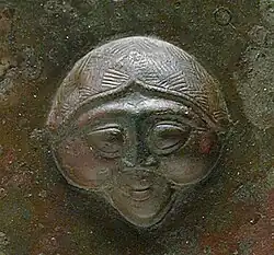Las caras están en su mayor parte redondeadas para llenar un espacio circular, y muchas pretenden ser femeninas. Carecen de barbas, y algunas figuras enteras son claramente femeninas, sentadas con las piernas abiertas mostrando una vulva, quizá mostrada dando a luz; en otros alfileres esto está claro. Estas piezas eran, presumiblemente, exvotos para la fertilidad. Los ojos a veces están incrustados en blanco, con un punto negro representando la pupila. La cabeza puede ocupar la mayor parte del disco, o ser pequeña, en el centro de un ancho borde con otros temas. Otros diseños presentan un amplio abanico de temas, con algunos motivos puramente decorativos, y otros presentan algunas escenas complejas, principalmente religiosas, con muchas figuras ("demonios de apariencia extraña y animales aparentemente involucrados en actividades de un culto y mitológicas", como las describe Muscarella).[39]