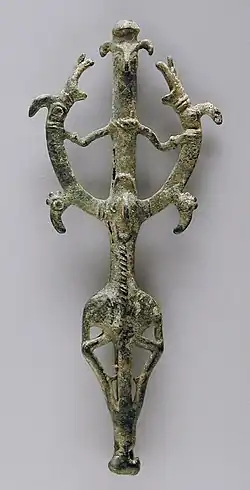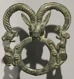 Tomando los grupos en lo que actualmente se considera que es su amplia secuencia cronológica, los primeros son los "remates de animales", con dos animales enfrentados rampantes, generalmente un ar de íbices cornilargos (o cabras o muflones) o felinos, uno frente al otro con un tubo central o anillos abiertos (formados en las uniones de sus atas delanteras y traseras) entre ellos. La cabra bezoar (capra aegagrus aegagrusis), la especie salvaje local de cabra o íbice, ya estaba domesticada miles de años antes;[26] tiene unos largos cuernos curvados con costillas nudosas. En comparación con los tipos posteriores, los animales son más naturalísticos, especialmente el grupo de íbices, aunque no tanto que se pueda identificar con seguridad la especie a la que pertenecían.[27] En algunos ejemplos las figuras son "demonios", con rasgos humanos excepto por sus largos cuernos.[28]