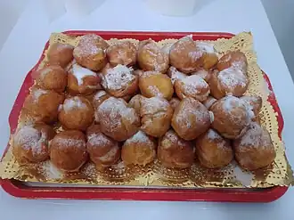 Los buñuelos de viento son bolas de masa elaborada con harina de trigo, manteca y huevos que resulta ser frita en aceite caliente. La masa suele tener forma de bola. La masa así frita puede llegar a doblar su volumen, es por esta razón por las que se les denomina con el apelativo «de viento» (es decir hinchados). Los buñuelos de viento pueden ser rellenos con dulces de crema, chocolate, chantillí, etcétera. Son un postre que aparece en las pastelerías a comienzos de noviembre, ya que tradicionalmente se sirven en las celebraciones de todos los santos.[1]