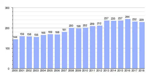 | Gráfica de evolución demográfica de Buceleiras entre 2000 y 2018 |