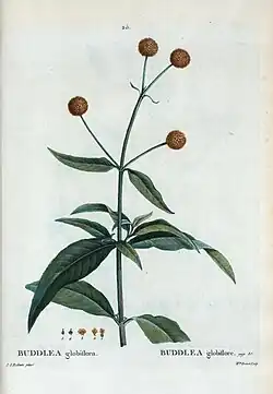 Buddleja globosa (Scrophulariaceae) descrita por John Hope y publicado en Verhandelingen uitgegeeven door de hollandse maatschappy der weetenschappen, te Haarlem 20(2): 417–418, pl. 11. 1782.[3]