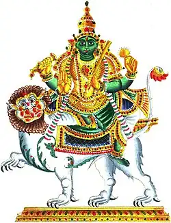 Se le representa como un varón suave, elocuente, y con una tez verdosa. En el templo Ramghur se lo representa con una cimitarra, una pesada maza de metal y un escudo, montando un león alado. En otras representaciones sostiene un cetro y un loto y monta un águila, un carro tirado por leones o está de pie sobre una alfombra.