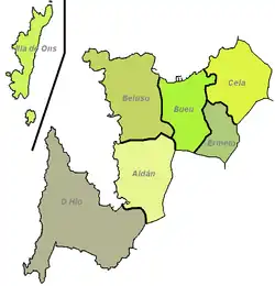Una de las peculiaridades del municipio es que una de sus parroquias es la Isla de Ons, localizada en la ría de Pontevedra y es la única isla del parque nacional de las Islas Atlánticas de Galicia que se encuentra habitada en la actualidad. Por otra parte, todas las parroquias del municipio son costeras a excepción de Ermelo.