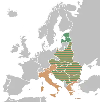Miembros fundadores (adheridos en 1921) Adheridos en 1927 Adheridos en 1934 Partido Popular Bávaro (implicado en 1921) Partido Agrario griego (adherido en 1930, expulsado en 1931) Nota: Las zonas rayadas representan partidos regionales.