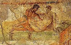 Los baños públicos eran también lugares habituales de las prostitutas durante el imperio. La desnudez –sobre todo si los hombres y las mujeres se bañaban juntos, como podía suceder–, que se ofrecía como la bebida en las tabernas, era un aliciente que conducía a los clientes a compañeras sexuales disponibles. Los baños también ofrecían comida y otros servicios, como masajes. De la misma manera que una masajista podía pasar con facilidad a proporcionar servicios sexuales, los empleados de los baños combinaban su trabajo rutinario, como vigilar la ropa mientras los clientes se bañaban, con el de proporcionar sexo a los clientes que lo deseaban. De hecho, en las termas suburbanas de Pompeya, las más excavadas, hay pinturas explícitas que muestran a personas participando en actividades sexuales cada vez más audaces (o divertidas), así como compartimentos sobre los estantes donde se guardaba la ropa antes de entrar en los baños. También había habitaciones en las plantas superiores, e incluso una entrada aparte desde la calle para los clientes que venían a los baños sólo a mantener relaciones sexuales. Un grafiti en la pared exterior dice lo siguiente: “Quien quiera que se siente aquí, lea esto antes que nada: si quiere fornicar, busque a Attis; puede ser suya por un denario” (CIL 4.1751).