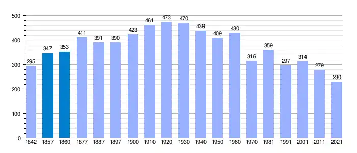 Gráfica de evolución demográfica de Burguete[11]​ entre 1842 y 2021