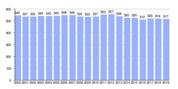 | Gráfica de evolución demográfica de Buscás entre 2000 y 2019 |