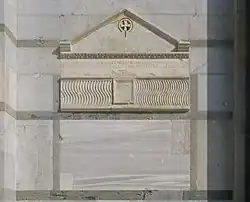 Hay un epígrafe sepulcral colocado en la primera arcada ciega de la fachada que también atestigua su nombre y donde reposan sus restos: