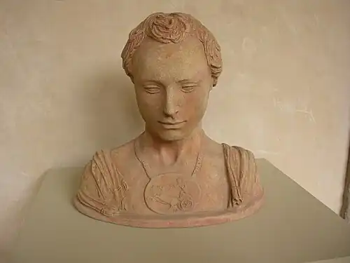 En este trabajo, el retrato de busto no se ha utilizado como un relicario, sino como un busto profano, sin ser un retrato real, más bien de tipo ideal. Sobre el pecho tiene un camafeo, copiado de uno antiguo que perteneció a la colección medicea; se representa el Carro de Eros, un tema mitológico presente en el diálogo de Fedro de Platón.