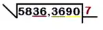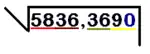 - Paso 1: Se separa el número del radicando (en el ejemplo, 5836,3690) en grupos de dos cifras. La separación se hace desde el signo de decimal (si lo hubiera) hacia la derecha y hacia la izquierda. Si del lado de los decimales (a la derecha de la coma, es decir 369) no hay un número par de cifras, es evidente que quedaría una suelta: en ese caso, se le añadiría un cero. Si del lado de los enteros (a la izquierda de la coma, es decir, 5836) quedara un número suelto, se quedaría así. En la imagen de la derecha podemos ver el número 5836,369 dividido en grupos de dos cifras; después del número 9 se ha agregado un cero (en azul) pues en el lado decimal no puede haber un grupo de una cifra (en el ejemplo, esta separación quedaría así: 58/36,36/90)