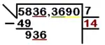 - Paso 3: El número obtenido (7) es el primer resultado de la raíz cuadrada. En el paso anterior lo escribíamos en el cajetín de la derecha. Ahora lo multiplicamos por sí mismo. El resultado (49) se escribe debajo del primer grupo de cifras de la izquierda (58), y se procede a restarlo. El resultado de la resta 58-49 es 9. Una vez obtenido el resultado de la resta, se baja el siguiente grupo de dos cifras (36), con lo que la siguiente cifra de la raíz es ahora la unión del resultado de la resta anterior con las nuevas cifras bajadas (es decir, 936).Para continuar la extracción de la raíz cuadrada multiplicamos por 2 el primer resultado (7) y lo escribimos justo debajo de éste, en el siguiente renglón auxiliar (en la imagen, el 14 está escrito justo debajo del 7, ya que 7 x 2 es 14).