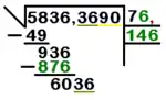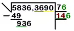 - Paso 5: El procedimiento es el mismo que anteriormente. El resultado de la operación anterior (876) se coloca debajo del número procedente de la resta anterior (936) y se restan. Al resultado de la resta (60) se le añade el siguiente grupo de cifras del radical (en este caso, 36). Si el siguiente grupo está después de la coma decimal se agrega una coma decimal al número de la raíz. El nuevo número obtenido es 6036.