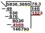 - Paso 6: Se retoma el procedimiento del paso 3. La cifra de la raíz (76) se multiplica por dos (resultando 152). Buscamos un número que añadido a 152 y multiplicado por ese mismo número nos dé una cantidad aproximada a 6036. Sería, por tanto, 1521 x 1, 1522 x 2, 1523 x 3, etc. Se puede hacer por tanteo, o por el procedimiento de dividir en este caso, las tres primeras cifras de la raíz por las tres primeras cifras de la línea auxiliar (nótese que antes eran las dos primeras cifras), es decir, 603/152 (el número buscado es 3, ya que el resultado es 3,9 y se ha dicho que la cifra que se debe tomar es la primera). La operación a realizar es, por tanto, 1523 x 3. El resultado (4569) se coloca bajo el último resto y se procede a hallar la diferencia, que es 1467. Una vez realizada la resta se baja el siguiente grupo de cifras y se continúa el proceso. Obsérvese que el número a dividir entre renglón auxiliar y residuo va aumentado.