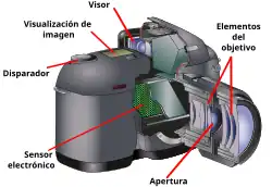 Las cámaras constan de una cámara oscura cerrada, con una abertura en uno de los extremos para que pueda entrar la luz, y una superficie plana de formación de la imagen o de visualización para capturar la luz en el otro extremo. La mayoría de las cámaras fotográficas tienen un objetivo formado de lentes, ubicado delante de la abertura de la cámara fotográfica para controlar la luz entrante y para enfocar la imagen, o parte de la imagen. El diámetro de esta abertura (conocido como apertura) suele modificarse con un diafragma, aunque algunos objetivos tienen apertura fija.