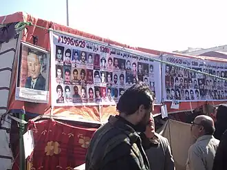 Personas en una manifestación en Bengasi mirando las fotografías de las víctimas de la masacre en la prisión de Abu Salim de febrero de 2011. | ||