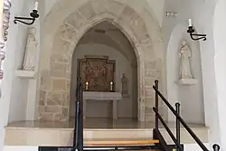 En el muro testero hay una mesa de altar y a la derecha una columna de piedra con capitel de estilo románico.