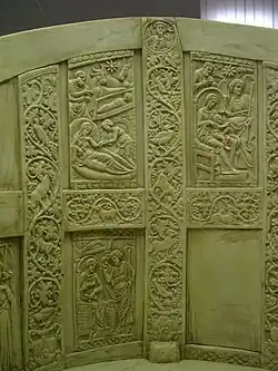 - «Escena de la Anunciación, aparece en cubiertas de libro de marfil de los Evangelios Etschmiadzin, y las cubiertas en la the Bibliotheque Nationale»[7]