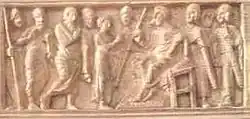 El joven José explica al faraón el sueño que ha tenido (Génesis 41, 14-36). Éste está sentado en su trono flanqueado por dos soldados armados con una espada. Otros soldados se encuentran cerca de dos adivinos vestidos con pallium de los filósofos, que no habían sabido dar una explicación satisfactoria.