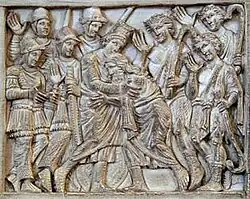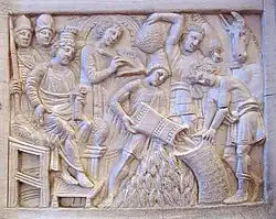 José representado en el centro es vendido por sus hermanos a unos mercaderes ismaelitas de Madian (Génesis 37, 28). Los que aparecen detrás de él sostienen un pendum (bastón de mango curvado). Los mercaderes, a la derecha caracterizados, tienen larga cabellera y se sitúan al lado de los camellos. Uno de los mercaderes tiene en su mano derecha una pequeña bolsa de dinero que va a dar a los hermanos de José.