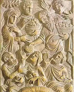 - La escena de la historia de Belén, José ayudando a la Virgen embarazada a subir al animal, que es guiado por un ángel, es un tipo de escena bien rara en el arte paleocristiano. Es de un tipo realizada con más probabilidad en Alejandría, donde se convirtió en un tipo característico en el arte copto.[2][7]