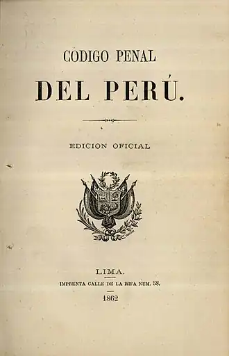 Tras la Independencia del Perú, la nueva república heredó el corpus legislativo de la época virreinal compuesto por las Siete Partidas, la Novísima Recopilación y en la Recopilación de leyes de Indias, sin conseguirse un texto unificado. Con el advenimiento de la Confederación Peruano-Boliviana, el general Santa Cruz impuso el código penal boliviano a la nueva nación unificada, pero tras su disolución, en 1839, el país volvió a quedar sin un código penal único. El Congreso hizo esfuerzos por legislar en este sentido y nombró comisiones para la redacción del cuerpo normativo. El resultado fue el Código Penal de 1863, promulgado el 10 de marzo de ese año. El código resultó ineficaz en su aplicación y se propuso su reforma, y en 1878 se aprobó la revisión del mismo.[3]