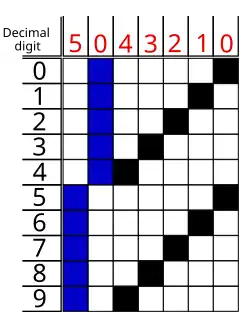 Valor Bits p-5-421 0 1-0-000 1 0-0-001 2 0-0-010 3 1-0-011 4 0-0-100 5 0-1-000 6 1-1-001 7 1-1-010 8 0-1-011 9 1-1-100