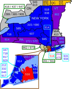 Este código de área abastecía los condados de Nassau y Suffolk hasta el 1 de noviembre de 1999, cuando el condado de Suffolk se le dio el código de área 631.[2]