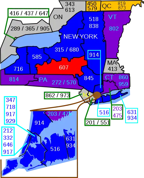 El código de área 607 es un código de área telefónica del estado de Nueva York, Estados Unidos, cuyo territorio de uso ocupa los condados de Southern Tier, lindando con el estado de Pensilvania. Se formó a partir de la división de los códigos de área 315 y 716 en 1954.[1] Inicialmente, a fines de la década de 1940, los códigos de área con un dígito medio de "0" (x0x-xxx-xxxx) se asignaban solo a las jurisdicciones que abarcaban un estado completo. Junto con 507 en Minnesota y 606 en Kentucky, 607 fue uno de los primeros códigos de área que se agregaron a una jurisdicción.
