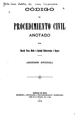 - ↑ Código de Procedimiento Civil (1902), anotado por David Toro Melo y Aníbal Echeverría y Reyes. Santiago de Chile: Imprenta, litografía y encuadernación Barcelona, Edición Oficial, página 7, texto disponible en: http://archive.org/stream/cdigodeprocedim00reyegoog#page/n24/mode/2up