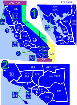 - Nota: Los límites de intercambio no siguen los límites de la ciudad o el condado; la mayoría de los códigos de área incluidos o excluidos de las se dividen en las ciudades o condados mencionados anteriormente. Por ejemplo, la frontera entre el 562 y 714 por lo general siguen la frontera entre los condados de Los Ángeles y Orange, pero las porciones del Condado de Los Ángeles están en el 714 y partes del Condado de Orange están en el 562. Del mismo modo, la mayoría de Daly City está en el 650, pero una pequeña parte se encuentra en el código de área 415.