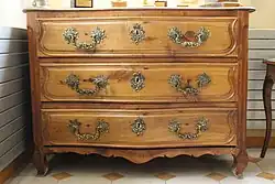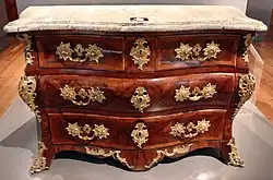 Uno de los primeros fabricantes de cómodas francesas fue André-Charles Boulle (1642-1732), cuyo modelo entregado al Gran Trianón en 1708 (llamado “oficina” por el taller) ilustra la tendencia barroca a ocultar la funcionalidad detrás de formas complejas.[5] A primera vista, los muebles con cajones de Boulle, que han sido realizados varias veces, recuerdan a un cofre colgante, posiblemente inspirado en las cajas colgantes de los carruajes de la época.[6]