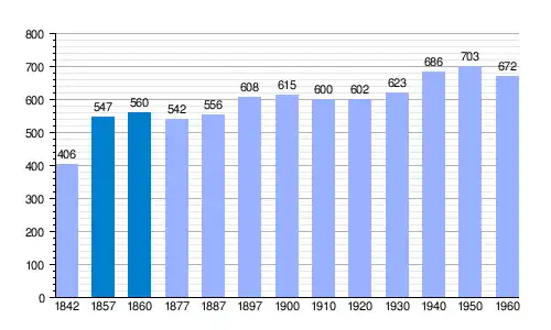 | Gráfica de evolución demográfica de Córcoles[3] entre 1842 y 1960 |