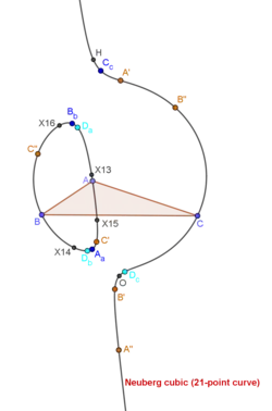 La figura adjunta muestra la cúbica de Neuberg del triángulo △ABC con los 21 puntos especiales mencionados anteriormente.