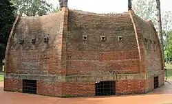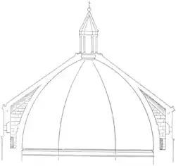 Una cúpula hemiesférica, parabólica o elipsoidal es una figura o lugar de puntos generados a partir de un arco que gira en torno a un eje vertical, denominada en este caso cúpula de revolución.[nota 12]Está formada por piezas llamadas dovelas que se disponen en forma de arco hasta la dovela superior o clave, que equilibra los esfuerzos de manera análoga a un arco o bóveda pero en tres dimensiones. Para permitir la entrada de luz al interior de la cúpula puede abrirse un óculo cenital, acompañado o no de una linterna. Para ello se sustituye la clave por un anillo superior de piezas que resistan los esfuerzos de compresión, en ocasiones realizado en bronce para una mayor estabilidad y durabilidad.[nota 13] Teóricamente, siempre es posible construir una cúpula de revolución, puesto que está constituida por infinitos anillos que se sujetan por sí mismos una vez completados. La técnica constructiva es bastante sencilla: los ladrillos se disponen en anillos circulares concéntricos superpuestos, cuyo diámetro disminuye a medida que se eleva hacia la cúspide. De este modo la estructura es autoportante, es decir, capaz de sujetarse por sí misma.[72]