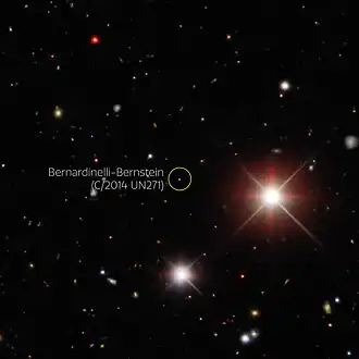 C/2014 UN271 (Bernardinelli-Bernstein), o 2014 UN271, o cometa Bernardinelli–Bernstein, es un cometa potencialmente grande de la nube de Oort descubierto por los astrónomos Pedro Bernardinelli y Gary Bernstein, en imágenes de archivo del Observatorio de la Energía Oscura.[1][2][3] La primera vez que fue observado, en octubre de 2014, el objeto se encontraba a 29 UA (4300 millones de kilómetros) del Sol, casi tan lejos como la órbita de Neptuno, la mayor distancia a la que había sido descubierto un cometa.[4][3] Para 2021, se aproximó al Sol a una distancia entre 19 UA (2800 millones de kilómetros) y 21 UA (3100 millones de kilómetros)[5] y alcanzará el perihelio a 10.9 UA (justo fuera de la órbita de Saturno) en enero de 2031.[6] La incertidumbre actual de la regla empírica en la distancia del cometa del Sol es ±60000 km.[5]