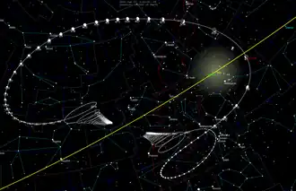 De enero a marzo de 2020, el cometa se ubicó en la constelación de la Osa Mayor. Durante todo el mes de abril, el cometa será visible en la constelación de Camelopardalis. El 12 de mayo se mudará a Perseo. Estará en su punto más cercano a la Tierra el 23 de mayo durante una Luna Nueva cuando el cometa estará a 17 grados del Sol. En su periheleón el 31 de mayo estará en la constelación de Tauro a 12 grados del Sol.[14]