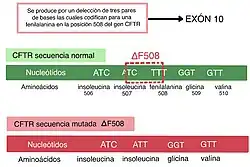 De entre las más de mil mutaciones que se han descrito, la más habitual es la ΔF508, que tiene lugar por la deleción de 3 pares de bases en el gen, lo cual ocasiona la pérdida del aminoácido fenilalanina en la posición 508 de la proteína. Las personas afectadas por esta mutación padecen fibrosis quística (FQ).[20] Esta enfermedad se desarrolla si los progenitores son portadores del gen mutado (ΔF508) y su descendiente herede las dos copias del gen de la proteína CFTR mutantes.[18] A pesar de que aproximadamente 242 de las mutaciones de esta proteína pueden desarrollar esta enfermedad, la mayoría son raras de encontrar.[21]