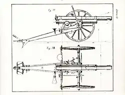 Inicialmente el transporte de la pieza se realizaba enganchando la pieza a un armón tirado por seis caballos; cada armón podía transportar 38 proyectiles. Adicionalmente, otro carro para munición con un armón similar y un retrotrén con otros 60 proyectiles estaba asignado también a cada pieza. El retrotrén podía ser de dos tipos: de granadas ordinarias y de metralla o de granadas rompedoras. El retrotrén estaba protegido en todos sus lados por chapa de acero. En el primer tipo incluía una caja de repuestos, cajas de espoletas, graduador de espoletas y bomba de inyección, en el de granadas rompedoras incluía cajas con cebos y estopines de repuesto y también con detonadores. Uno de los retrotrenes de cada batería estaba equipado con un observatorio protegido por un escudo que permitía al jefe de la batería observar al enemigo y dirigir el tiro de las piezas.[29] Cada batería estaba equipada con cuatro piezas. En tiempo de paz, la plantilla de cada batería incluía cincuenta caballos de tiro y trece de monta, con cuatro caballos de tiro asignados al carro de munición de cada pieza, otros cuatro para cada uno de los dos carros de batería y dos más de reserva. En tiempo de guerra, cada batería debía recibir cuatro carros más de municiones, con todos los carros pasando a ser tirados por seis caballos en este caso, sumando un total de noventa caballos de tiro por batería, seis de ellos de reserva.[30] El regimiento a caballo contaba con caballos de monta adicionales para que todos los hombres de la batería pudieran ir montados, ya en caballos de tiro o en caballos de monta.[31]