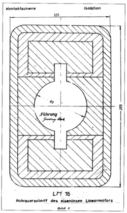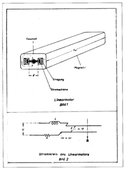 Durante 1918, el inventor francés Louis Octave Fauchon-Villeplee inventó un cañón eléctrico que tiene un gran parecido con el motor lineal. Presentó una solicitud de patente en Estados Unidos el 1 de abril de 1919, la que le fue concedida en julio de 1922 con el N.º 1.421.435, como un "Aparato Eléctrico para Propulsar Proyectiles".[2] En su dispositivo, dos barras conductoras paralelas están conectadas por las aletas del proyectil, y todo el aparato está rodeado por un campo magnético. Al pasar corriente por las barras y el proyectil, se induce una fuerza la cual impulsa el proyectil a lo largo de las barras y hacia el exterior del aparato.[3]