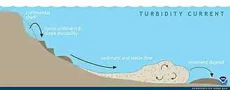Las corrientes de turbidez que se encuentran en el cañón del Congo son las más fuertes medidas en el mundo.[3] Se trata esencialmente de avalanchas submarinas que pueden propagarse durante cientos de kilómetros, cuya fuerza y frecuencia se relacionan fuertemente con el período de mayor caudal del río Congo. Sus velocidades varían de aproximadamente 0,7 m/s a 3,5 m/s y los eventos pueden durar más de una semana.[4] Estas corrientes son la fuente principal de erosión en el cañón y representan una porción significativa del sedimento que termina en el abanico al final del cañón. Suelen dañar equipos colocados en el fondo del océano, como amarres y cables telegráficos.[1]