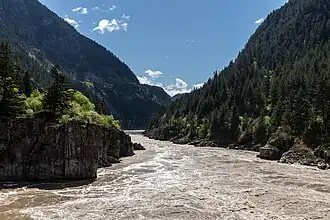 Al norte de Lytton, le sigue la autopista 12 de la Columbia Británica, y luego desde Lillooet a Pavilion por la autopista 99 de la Columbia Británica (el extremo más alejado de la autopista Sea-to-Sky, aunque no lleva ese nombre en esta zona). La línea del ferrocarril de la Columbia Británica (el ferrocarril de la Columbia Británica es ahora propiedad de la CN y está operado por ella) sigue el mismo tramo del cañón desde Lillooet hasta poco más allá de Pavilion. Desde allí y la desembocadura del río Chilcotin solo hay caminos rurales escabrosos, y el terreno es una mezcla de las profundidades del cañón flanqueadas por áridos bancos y altas mesetas. Entre Pavilion y Lillooet, la garganta del río presenta su máxima profundidad, con el río estrangulado que corre a través de una serie de estrechos desfiladeros rodeados por altos acantilados, aunque todavía flanqueado por encima de esos acantilados por amplios bancos que se erigen en las laderas de las cordilleras que flanquean la garganta.