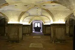 Debajo de la iglesia hay una baja cripta, cuyas bóvedas rebajadas están sostenidas por poderosos pilares cuadrados. Conserva escasos restos de la decoración original al fresco, perdida a causa de la humedad, además del altar sin adornos. Fue utilizada en los siglos como osario para los muertos del hospital, que fueron enterrados aquí a miles. En particular, alojó también los cuerpos de los caídos en las Cinco jornadas de Milán, posteriormente trasladados bajo el monumento erigido a tal efecto por Grandi en la plaza homónima. Siguen todavía en las paredes numerosos nombres de los patriotas antiguamente enterrados en su interior.