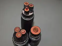 - Para los conductores de energía eléctrica como subconjunto de líneas eléctricas, solo existe el término global sistemas de cables y líneas con la entrada IEV 826-15-01 (IEV es por, sus siglas en inglés, International Electrotechnical Vocabulary).[4] Se hace una distinción detallada entre cables de instalación y cables en las respectivas normas de producto en el grupo VDE 0200 (para cables en particular VDE 0266, VDE 0271 y VDE 0276-603 a -632). En general, se estipula que los cables como conductores de energía “soportan mayores tensiones mecánicas en comparación con los cables y se colocan en el suelo” (→ cables subterráneos),[5][6] independientemente de si son unipolares o multipolares. -Núcleos conductores de energía.